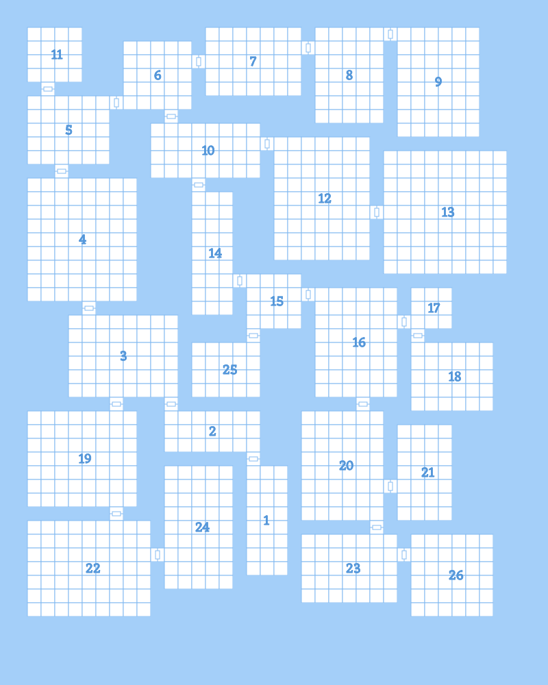 The above is an example of the maps it currently generates. In terms of pathing, there is a pretty linear flow to the dungeon layout - a higher-number room is deeper into the dungeon. This makes it easy to determine where to put goals like boss encounters. However, it also means the dungeon doesn't encourage exploration or reward players who enjoy that activity, and really it gets a little boring.